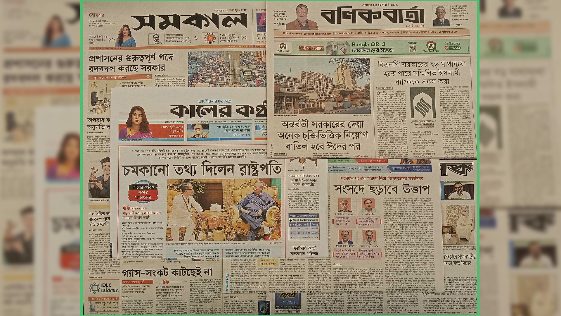 প্রতিদিন পাঠকের কাছে দেশের আলোচিত ঘটনা, রাজনৈতিক উত্তাপ, অর্থনৈতিক পরিস্থিতি, সমাজের পরিবর্তন এবং বিশ্বমঞ্চের নতুন বার্তা তুলে ধরে সংবাদপত্রগুলো। তথ্যপিপাসুদের তথ্যের চাহিদা মেটাতে সময় সংবাদ দেশের প্রধান প্রধান সংবাদপত্রের গুরুত্বপূর্ণ শিরোনাম পাঠকের সামনে তুলে ধরছে। এক নজরে জেনে নিন দেশের প্রধান সংবাদপত্রগুলোর প্রতিবেদন।দেশের শীর্ষস্থানীয় জাতীয় পত্রিকায় সোমবার (২৩ ফেব্রুয়ারি) প্রকাশিত কিছু খবর নিচে তুলে ধরা হলো। চমকানো তথ্য দিলেন রাষ্ট্রপতি - দৈনিক কালের কণ্ঠের প্রধান সংবাদ এটি। প্রতিবেদনে বলা হয়েছে, এ যেন এক প্রাসাদবন্দি রাষ্ট্রপতির রোমহর্ষক গল্প। টানা দেড় বছরের সেই বন্দিদশা আর নেই। আর সেই স্বস্তিতেই রুদ্ধকালের ঘটনাপঞ্জি প্রাণখুলে তুলে ধরেছেন রাষ্ট্রপ্রধান মো. সাহাবুদ্দিন। গত শুক্রবার রাতে বঙ্গভবনে রাষ্ট্রপতির কার্যালয়ে তার একান্ত সাক্ষাৎকার নিয়েছে কালের কণ্ঠ। সাক্ষাৎকারটিই সংবাদ আকারে প্রকাশ করেছে দৈনিক পত্রিকাটি।প্রশাসনের গুরুত্বপূর্ণ পদে রদবদল করছে সরকার - দৈনিক সমকালের প্রধান শিরোনাম এটি।প্রতিবেদনে বলা হয়েছে, সামরিক-বেসামরিক প্রশাসনে পরিবর্তন আনতে শুরু করেছে প্রধানমন্ত্রী তারেক রহমানের নেতৃত্বাধীন নতুন সরকার। এরই মধ্যে বেসামরিক প্রশাসনের শীর্ষ দুই পদে পরিবর্তন আনা হয়েছে। গতকাল রোববার সেনাবাহিনীর আটটি গুরুত্বপূর্ণ পদে রদবদল করা হয়েছে। পুলিশের শীর্ষ পর্যায়ে পরিবর্তন আনা হবে। বিভিন্ন বিশ্ববিদ্যালয়ের উপাচার্যসহ জ্যেষ্ঠ পদগুলোতেও পরিবর্তনের সম্ভাবনা রয়েছে। তবে সরকারের দায়িত্বশীল ব্যক্তিরা বলছেন, প্রধানমন্ত্রী তারেক রহমানের নেতৃত্বাধীন সরকার বেসামরিক প্রশাসনেও ধীরে ধীরে পরিবর্তন আনবে। তবে একবারে নয়, পর্যায়ক্রমে রদবদল করা হবে। অন্তর্বর্তী সরকারের দেয়া অনেক চুক্তিভিত্তিক নিয়োগ বাতিল হবে ঈদের পর - দৈনিক বণিকবার্তার প্রধান সংবাদ এটি। প্রতিবেদনে বলা হয়েছে, ছাত্র-জনতার গণ-অভ্যুত্থানে আওয়ামী লীগ সরকার ক্ষমতাচ্যুত হলে দায়িত্ব নেয় অন্তর্বর্তী সরকার। এরপর তারা বিভিন্ন মন্ত্রণালয়, বিভাগ, সরকারি সংস্থা, স্বায়ত্তশাসিত প্রতিষ্ঠানে ঢালাওভাবে চুক্তিভিত্তিক নিয়োগ দেয়। সে সময়ে চুক্তিভিত্তিক নিয়োগ পাওয়া কর্মকর্তাদের বড় অংশ এখনো বিভিন্ন মন্ত্রণালয়ের সচিব ও দফতরপ্রধান হিসেবে কর্মরত। তবে আসন্ন ঈদুল ফিতরের পর চুক্তিভিত্তিক অনেক কর্মকর্তার নিয়োগ বাতিল হবে বলে জানা গেছে। এছাড়া চুক্তিভিত্তিক অনেক কর্মকর্তার মেয়াদ শেষের দিকে। অনেকে আবার নিজেই পদ থেকে সরে যাচ্ছেন।সংসদে ছড়াবে উত্তাপ - দৈনিক যুগান্তরের প্রধান খবর এটি।প্রতিবেদনে বলা হয়েছে, ত্রয়োদশ জাতীয় সংসদ নির্ব
