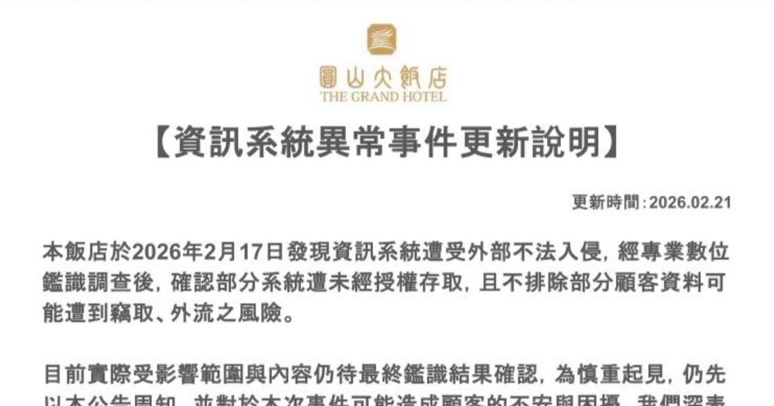 圓山大飯店於二月偵測其資訊系統遭未經授權存取,不排除部分顧客個資外洩。飯店已啟動資安應變機制、通報主管機關並委請專家鑑識。目前營運正常,並提醒顧客慎防可疑通訊,避免詐騙風險。