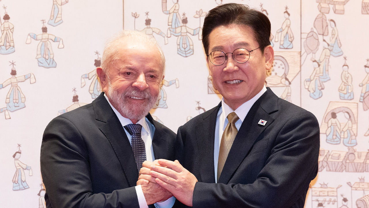 ▲ 이재명 대통령과 루이스 이나시우 룰라 다시우바 브라질 대통령이 23일 청와대에서 국빈 방한 공식 환영식 후 기념 촬영을 하고 있다…