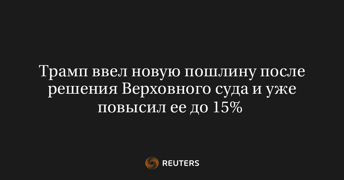 ВАШИНГТОН, 23 фев (Рейтер) - Президент США Дональд Трамп сообщил в субботу, что временная пошлина на товары из всех стран будет повышена с 10% до 15% - максимально допустимого по закону уровня - после того, как Верховный суд в пятницу отменил "ковровые" сборы на импорт, введенные в апреле 2025 года на основании закона о чрезвычайных ситуациях национального масштаба.