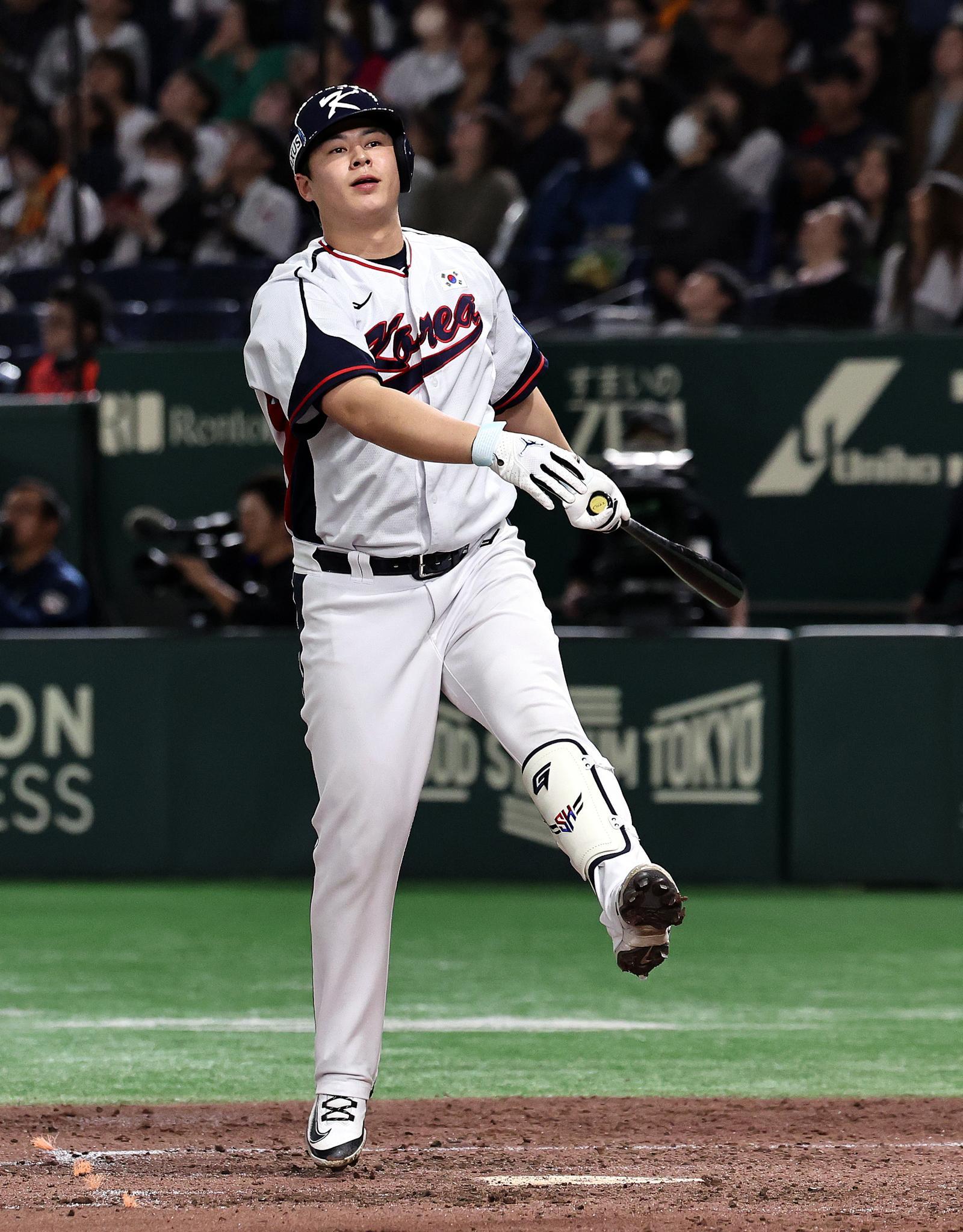 한국프로야구(KBO)를 대표하는 20대 거포 노시환(26·한화)이 계약 테이블과 타석에서 모두 ‘초대형 홈런’을 터뜨렸다.한화 구단은 23일 오전 8시 “노시환과 2027시즌부터 2037시즌까지 11년 간 최대 총액 307억 원에 비(非)자유계약선수(FA) 다년계약을 맺었다”고 알렸다.그리고 노시환은 정확히 5시간 뒤 일본 오키나와현 가데나 구장에서 열린 소속팀 한화와의 연습경기에 월드베이스볼클래식(WBC) 한국 대표팀 7번 타자로 나서 첫 타석부터 좌월 2점 홈런을 쏘아 올렸다. “(노시환이) 초대형 계약을 떠뜨렸으니 타석에서도 터질 것”이라던 김경문 한화 감독의 예언이 들어맞은 순간이었다.앞선 두 번의 연습경기에서 6타수 무안타로 침묵했던 노시환은 “어제(22일) 저녁 계약서에 사인하고 나니 마음이 후련했다. 뭔가 하나 나올 줄 알았는데 진짜 (홈런이) 나와서 다행”이라며 웃었다. 이어 “한화에서 ‘영구결번’ 선수가 되겠다는 나의 꿈에 한 발짝 다가선 것 같아 스스로가 자랑스럽다
