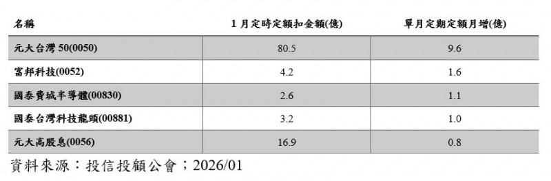 台股表現亮眼,1月年終入帳,不少投資人想要利滾利、直接投入ETF,據投信投顧公會最新資料,2026年1月ETF定期定額仍由元大台灣50(0050)獨占鰲頭,且定期定額扣款...…