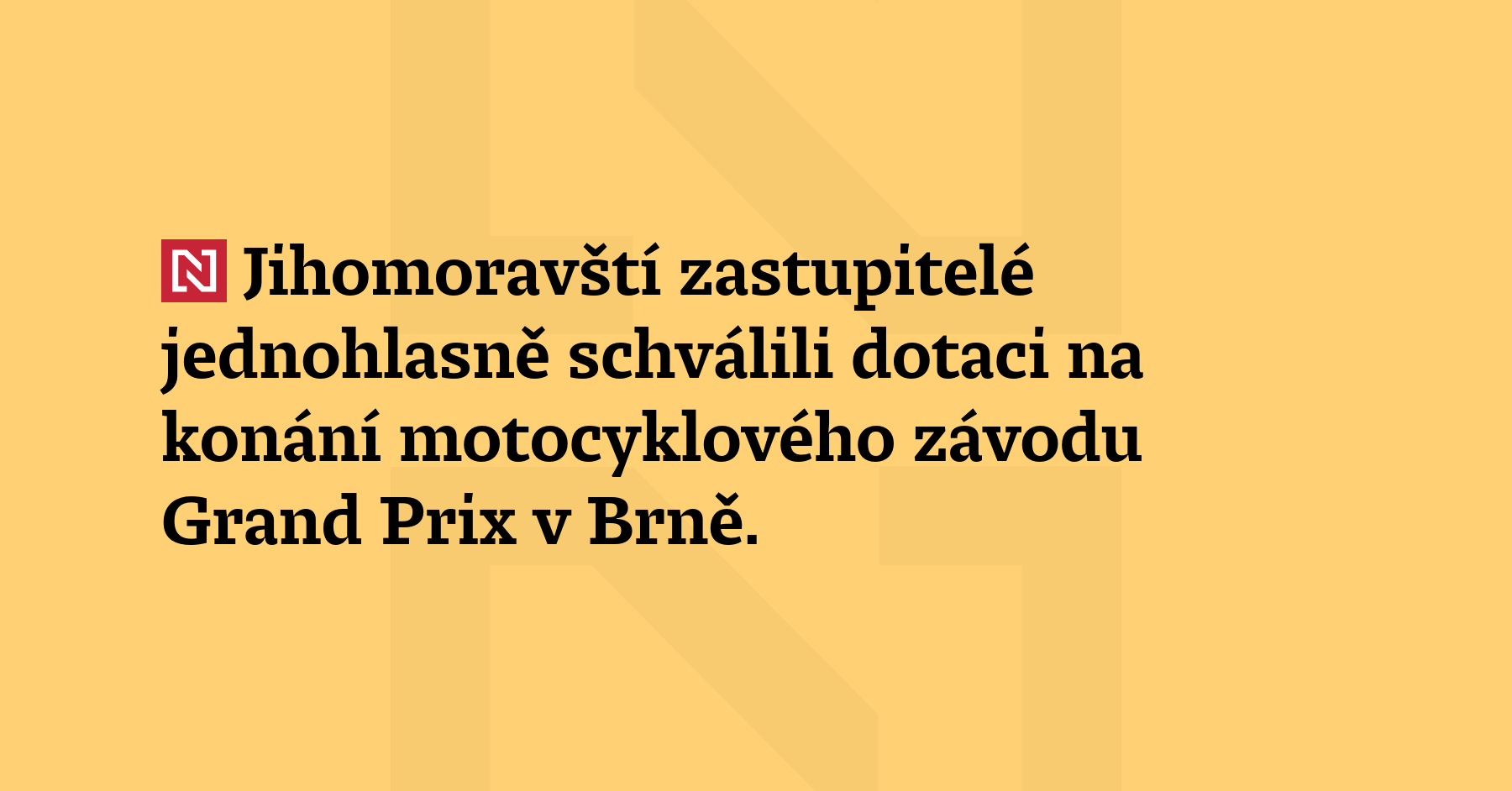 Jihomoravští zastupitelé jednohlasně schválili dotaci na konání motocyklového závodu Grand Prix v Brně. Na konání Velké ceny přispěje kraj Autoklubu ČR stejně jako loni 35 miliony korun. Stejnou částku na podporu závodu nedávno schválili i brněnští zastupitelé.