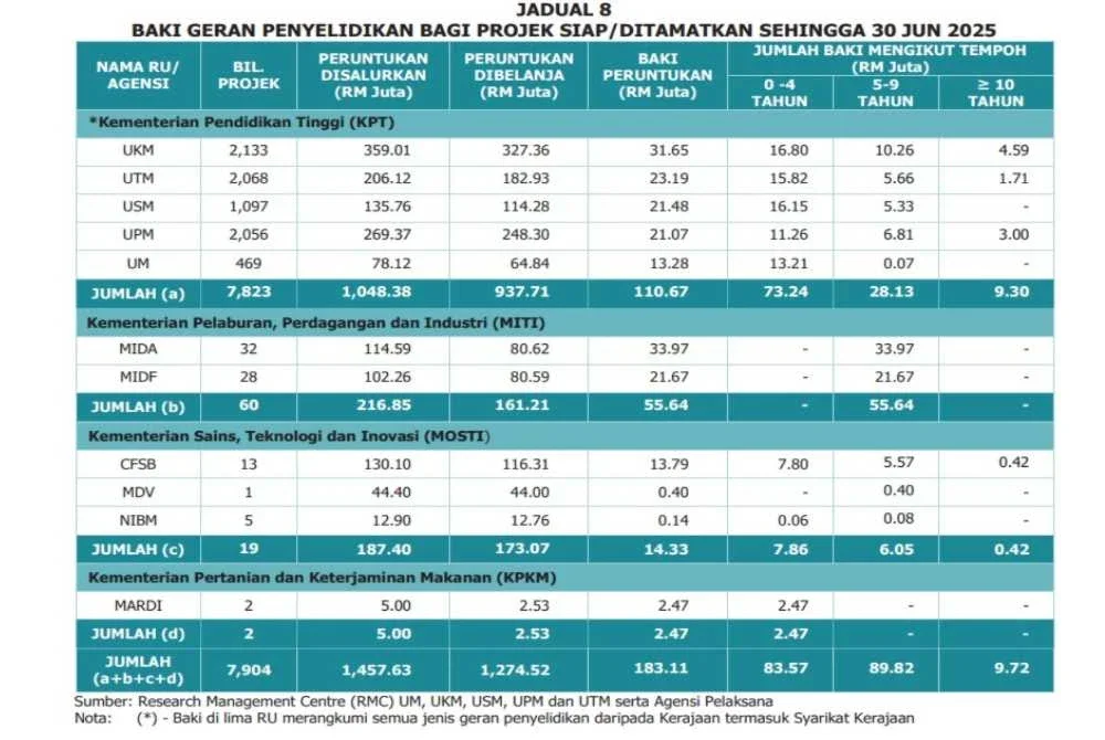 SHAH ALAM - Baki geran penyelidikan yang tidak dipulangkan di empat kementerian berjumlah RM183.11 juta melibatkan 7,904 projek setakat 30 Jun tahun lalu menunjukkan kelemahan dalam pengurusan kawalan kewangan, pemantauan projek dan tatacara penutupan projek.Laporan Ketua Audit Negara (LKAN) 1/2026 berkata, keadaan itu menunjukkan dana penyelidikan tidak digunakan secara cekap untuk memberi impak yang ditetapkan.Ia membabitkan Kementerian Pendidikan Tinggi (KPT), Kementerian Pelaburan, Perdagangan dan Industri (MITI), Kementerian Sains, Teknologi dan Inovasi (MOSTI) dan Kementerian Pertanian dan Keterjaminan Makanan (KPKM).Di bawah KPT, ia melibatkan lima universiti penyelidikan (RU) iaitu Universiti Kebangsaan Malaysia (UKM), Universiti Teknologi Malaysia (UTM), Universiti Sains Malaysia (USM), Universiti Putra Malaysia (UPM) dan Universiti Malaya (UM).UKM merekodkan baki peruntukan sebanyak RM31.65 juta, UTM (RM23.19 juta), USM (RM21.48 juta), UPM (RM21.07 juta) dan UM (RM13.28 juta) yang keseluruhannya RM110.67 juta.MITI mencatatkan baki geran penyelidikan di bawah agensi pelaksana Lembaga Pembangunan Pelaburan Malaysia (MIDA) sebanyak RM33.97 juta dan MIDF (RM21.67 juta) yang kedua-duanya berjumlah RM55.64 juta.MOSTI dan KPKM pula masing-masing merekodkan jumlah baki geran sebanyak RM14.33 juta dan RM183.11 juta.LKAN menjelaskan, baki geran penyelidikan di lima RU dan enam agensi pelaksana tidak dipulangkan kepada kementerian masing-masing merupakan projek siap atau ditamatkan."Baki tertinggi yang tidak dipulangkan adalah KPT melibatkan lima RU berjumlah RM110.67 juta bagi 7,823 projek."Analisis audit mendapati sejumlah RM9.72 juta atau 5.3 peratus merupakan baki yang melebihi tempoh 10 tahun manakala sejumlah RM89.82 juta atau 49 peratus adalah baki bagi tempoh antara lima hingga sembilan tahun," ujarnya.Katanya, baki geran penyelidikan yang tidak dipantau oleh kementerian berisiko digunakan untuk tujuan selain dari kelulusan asal.