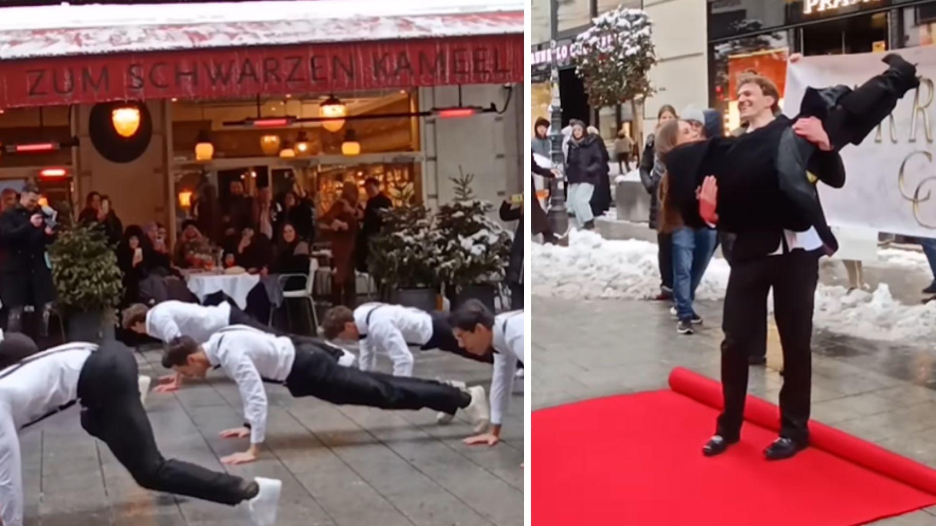 Am Freitag gegen 16:30 Uhr erlebten die Gäste eines der bekanntesten Traditionslokale der Stadt sowie vorbeischlendernde Passanten eine außergewöhnliche Darbietung: Eine Gruppe junge Männer in Anzughose, weißem Hemd, Hosenträgern und Fliege erscheint plötzlich vor dem "Schwarzen Kameel" und startet eine Tanzeinlage. Der Grund für den Flashmob mitten im 1. Bezirk Wiens : Der Protagonist der Tanztruppe möchte um die Hand seiner Partnerin anhalten , die mit ihren Freundinnen ihren 30. Geburtstag im Schanigarten des Kult-Restaurants feiert. Heiratsantrag vor dem "Schwarzen Kameel" in Wien Ein Video des Antrags wurde auf den Social-Media-Kanälen der Heute -Zeitung veröffentlicht. Auf Instagram hat das Reel bereits über eine halbe Million Aufrufe gesammelt. Darin ist zu sehen, wie zunächst der ikonische Striptease-Song "Pony" von Ginuwine aus den Lautsprechern ertönt. Für wenig Sekunden lässt der Protagonist seinen freien Oberkörper aufblitzen. Wie er selbst sagt, um seine Angebetete damit bewusst auf eine falsche Fährte zu locken. Seine Freunde assistieren beim raschen Outfitwechsel: Das lässige weiße T-Shirt weicht einem eleganten Hemd. Es folgte eine einstudierte Choreografie mit eingebauten Liegestützen, begleitet von Bruno Mars' Hit "Marry You" . Spätestens jetzt dürfte der Auserwählten klar sein, worauf es hinausläuft. Schließlich gilt das Lied weltweit als einer der beliebtesten Heiratsantrags-Hymnen. Roter Teppich, Outfitwechsel und Heirats-Banner Zwei Männer positionieren anschließend einen dunklen Vorhang vor dem Tisch mit der Frauenrunde. Dahinter wird in Windeseile ein roter Teppich ausgerollt , ein Banner mit den Worten "Marry me" in die Höhe gehalten und der Antragsteller streift sich Sakko und Anzugschuhe über – alles innerhalb weniger Sekunden. Anschließend tritt er vor seine Partnerin, geht mit einem Ring in der Hand auf die Knie und stellt die Frage aller Fragen. Unter tosendem Applaus sagt sie Ja und das Paar fällt sich überwältigt in die Arme. Die Heute berichtet, dass sich die frisch Verlobten vor rund sechs Jahren während des Medizinstudiums kennengelernt haben. Der 30-jährige Assistenzarzt für Augenheilkunde erzählt der Zeitung, dass er schon länger darüber nachgedacht habe, wann und wie er um die Hand seiner Partnerin Cassandra anhalten könnte: "Ich spiele schon sehr lange mit dem Heiratsgedanken, und ihr 30. Geburtstag war einfach die perfekte Gelegenheit für diesen Flashmob, ohne dass sie vorher Verdacht schöpft." Die Überraschung scheint vollends gelungen zu sein und das Paar freut sich bereits auf die gemeinsamen Hochzeitsvorbereitungen. Zum Abschluss gibt es noch eine innige Liebeserklärung an die Allgemeinmedizinerin: "Cassy ist mein absoluter Lieblingsmensch, weil ich mit niemandem sonst auf dieser Welt so herrlich unbeschwert über den dümmsten Blödsinn lachen kann. Sie ist mein Ruhepol, wenn mir alles zu viel wird, und eine Frau, für die man sich im tiefsten Winter am Wiener Graben wahnsinnig gerne zum Idioten macht."