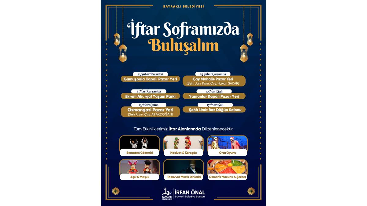 Bayraklı Belediyesi, Ramazan ayı kapsamında ilçenin farklı noktalarında iftar programları ve geleneksel etkinlikler düzenleyecek. Bu kapsamda hazırlanan ilk Ramazan sofrası bugün kuruluyor. Ramazan ayı boyunca kurulacak iftar sofralarında vatandaşlar bir araya gelecek; programların ardından Ramazan kültürüne özgü gösteriler gerçekleştirilecek.