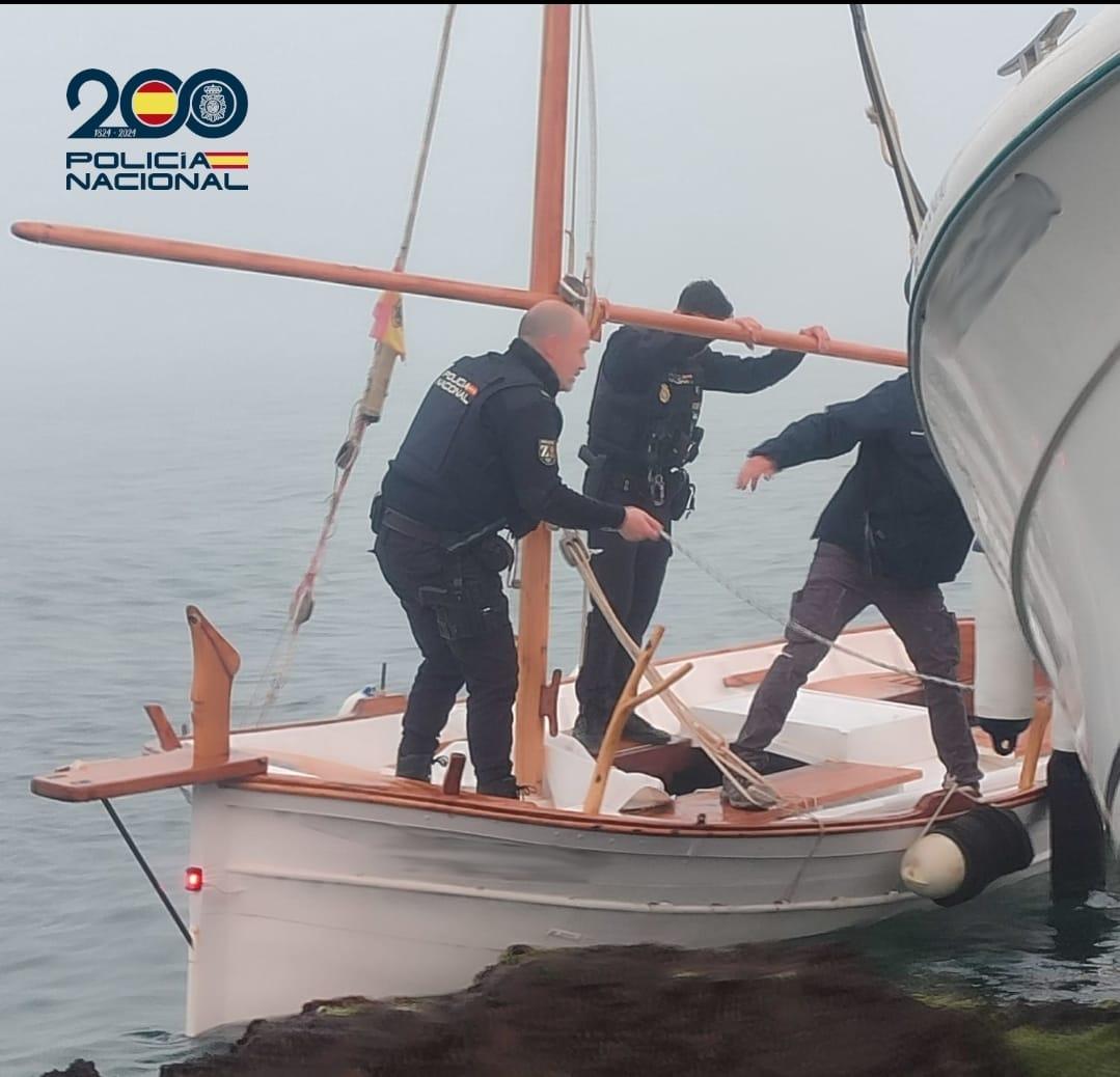 Dos agentes de la Policía Nacional han rescatado este lunes por la mañana a dos hombres que han sufrido un accidente con su llaüt en Cala Gamba. Los tripulantes de la embarcación han colisionado contra un rompeolas a causa de la niebla.
