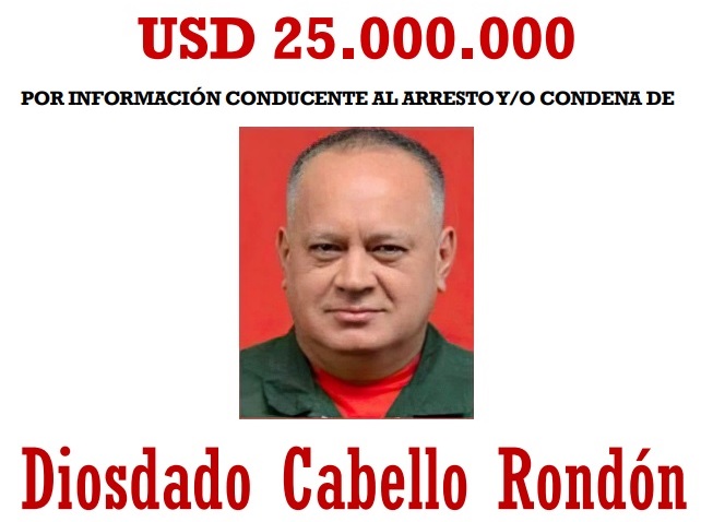 Washington ofrece 25 millones de dólares por el jerarca chavista, a quien acusan de narcoterrorismo y relacionan con el Cártel de los Soles.