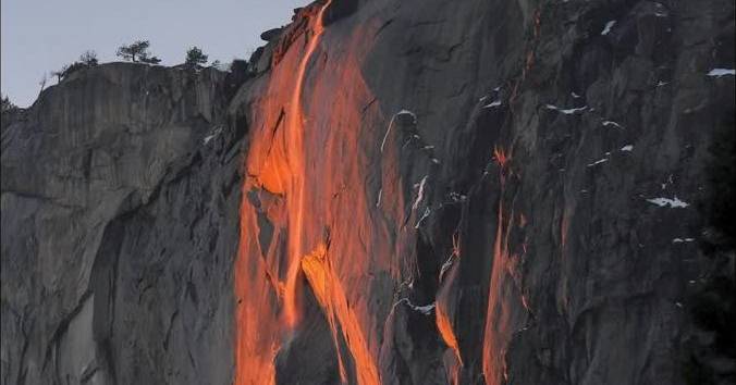O Parque Nacional de Yosemite, na Califórnia, receber nesta altura do ano milhares de visitantes para testemunhar o raro fenómeno natural conhecido como "Cascata de Fogo". O espetáculo ocorre quando o pôr do sol incide sobre a Cascata Horsetail, criando a ilusão de água laranja incandescente a escorrer pela face granítica de El Capitan. Este efeito luminoso só acontece em meados ou final de fevereiro, em noites de céu limpo e quando a cascata tem caudal suficiente.