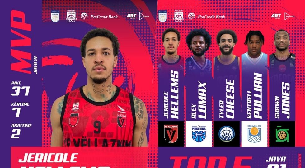Java e 21-të në ProCredit Superligë solli përballje shumë interesante dhe dramë deri në fund. Vëllaznimi shënoi fitore shumë të rëndësishme ndaj GO+ Pejës, ku sërish më i miri ishte Jericole Hellems. Ai kishte 37 pikë, shtatë kërcime e dy asistime, duke pasur indeksin 38, apo më të lartin në këtë xhiro. Hellems shpallet MVP i javës. Ai ka qenë ndër lojtarët kyç të kuqezinjve që nga rikthimi i tij në Gjakovë. Bora po ashtu po vazhdon me formë të mirë në vitin 2026, ku kësaj radhe fitoi ndaj Bashkimit, derisa u dallua Tyler Cheese me 32 pikë, shtatë kërcime dhe tri asistime, ku ishte bindshëm basketbollisti më i mirë i ndeshjes dhe njëri ndër më të mirët e kësaj jave. Rahoveci 029 po ashtu shënoi fitore të rëndësishme ndaj Golden Eagle Yllit, ku u dallua organizatori Kentrell Pullian me 29 pikë, katër kërcime e pesë asistime. Derbin e javës e fitoi Trepça ndaj Sigal Prishtinës 84:86, ku hero në fund ishte Shawn Jones me dy pikët vendimtare. Jones, ish-basketbollisti i Kosovës e mbylli ndeshjen me 16 pikë, gjashtë kërcime dhe një asistim, duke qenë më i dalluari te mitrovicasit në këtë sfidë, kurse në anën tjetër Alex Lomax ishte më i miri te kryeqytetasit me 24 pikë, shtatë kërcime dhe shtatë asistime. MVP Jericole Hellems (Vëllaznimi) 37 pikë, 7 kërcime, 2 asistime, 38 indeksi Top 5 Jericole Hellems (Vëllaznimi) 37 pikë, 7 kërcime, 2 asistime, 38 indeksi Alex Lomax (Sigal Prishtina) 24 pikë, 7 kërcime, 7 asistime, 35 indeksi Tyler Cheese (Bora) 32 pikë, 7 kërcime, 3 asistime, 34 indeksi Kentrell Pullian (Rahoveci 029) 29 pikë, 4 kërcime, 5 asistime, 26 indeksi Shawn Jones (Trepça) 16 pikë, 6 kërcime, 1 asistim, 21 indeksi