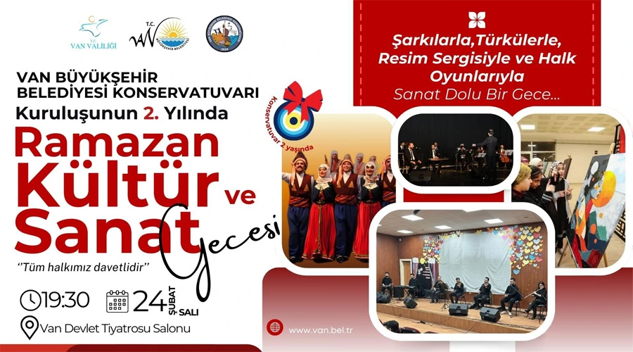 van büyükşehir belediyesi konservatuvarı, kuruluş yıldönümünü "ramazan kültür ve sanat gecesi" ile kutluyor. 24 şubat salı akşamı van devlet tiyatrosu'nda ücretsiz gerçekleşecek etkinlikte müzik, resim ve halk oyunları var. tüm van halkı davetlidir.