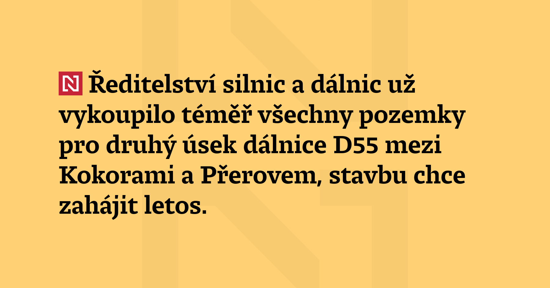 Ředitelství silnic a dálnic už vykoupilo téměř všechny pozemky pro druhý úsek dálnice D55 mezi Kokorami a Přerovem, stavbu chce zahájit letos. Tato část dálnice, která má být zprovozněna v roce 2029, naváže na první polovinu D55 z Olomouce do Kokor otevřenou loni v prosinci. (ČKT)