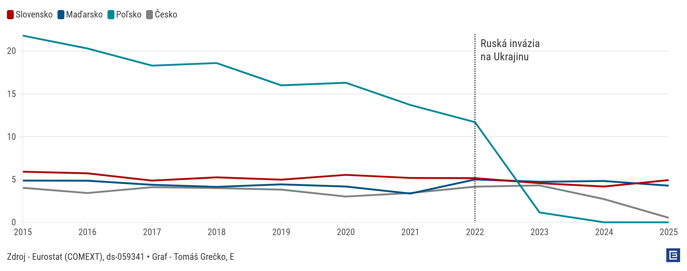 Aj po štyroch rokoch od ruskej invázie na Ukrajinu posielajú Slovensko a Maďarsko za ropu Kremľu spolu približne štyri miliardy eur ročne. Cena benzínu bez daní je pritom v krajinách V4 takmer rovnaká, hoci ruská ropa Urals je lacnejšia. Graf dňa pripravil Tomáš Zemko. Kým Česko a Poľsko sa po ruskej invázii na Ukrajinu odstrihli od ruskej ropy, […]