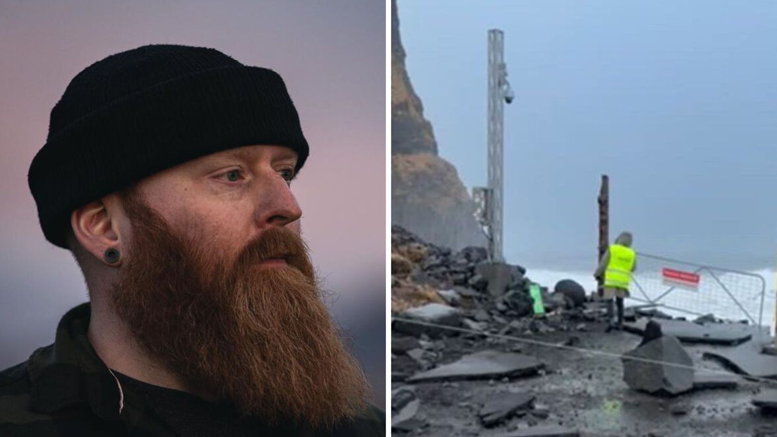 Gríðarleg ölduhæð var við Reynisfjöru í morgun í stórstreymi og segir leiðsögumaður að útsýnispallur og gangvegur við fjöruna séu að mestu horfnir á braut. Þá er annað skiltið auk þess horfið á braut.