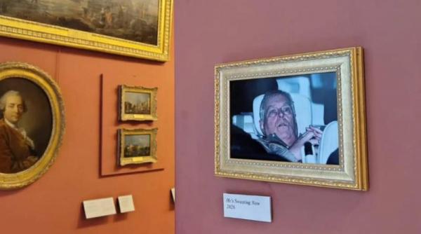 Grupul activist britanic „Toată lumea îl urăște pe Musk” a reușit să expună clasica, de-acum, fotografie a lui Andrew Mountbatten-Windsor, speriat pe bancheta din spate a mașinii de poliție, în muzeul Louvre, iar titlul a fost „Transpiră acum”.
