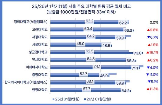서울 주요 대학가 원룸의 평균 월세가 1년 새 2% 올라 62만원을 넘어선 것으로 나타났다. 24일 부동산 정보 플랫폼 ‘다방’이 지난달 기준 다방에 등록된 서울 주요 10개 대학 인근 원룸의 월세를 분석한 결과, 보증금 1000만원에 전용면적 33㎡ 이하인 원룸의 월세는 평균 62만2000원으로 조사됐다. 이는 지난해 같은 달 60만9000원과 비교해 2.0% 상승한 수치며, 다방이 관련 분석을 시작한 2019년 이래 가장 높은 수준이다. 대학가 원룸 평균 월세는 작년 7월 소폭 하락세를 보였는데, 그때와 견주면 7.1%로 상승폭이 더 크다. 지역별로 보면 10개 대학 중 5곳에서 1년 새 평균 월세가 올랐다. 성균관대학교 인근 지역이 작년 1월 62만5000원에서 올해 1월 73만8000원으로 18.1% 올라 가장 큰 상승률을 보였다. 그 뒤는 한양대 11.3%(57만7000원→64만2000원), 고려대 9.8%(60만4000원→66만3000원), 연세대 6.2%(64만