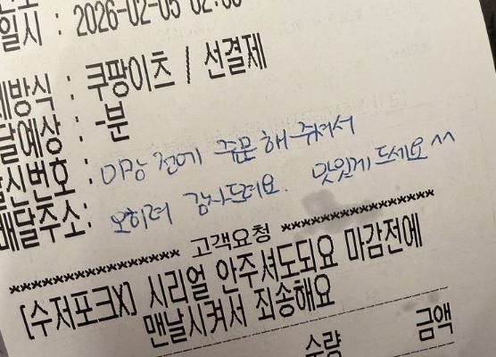 “마감 전에 맨날 시켜서 죄송해요.”“마감 전에 주문해 주셔서 오히려 감사드려요. 맛있게 드세요.”음식점 점주가 영업 종료 직전 배달 플랫폼으로 음식을 주문하며 미안해하는 고객에게 손글씨로 감사 인사를 전한 것으로 보이는 영수증 사진이 24일 온라인에서 확산했다.이날 소셜미디어 X(옛 트위터)에선 배달 플랫폼 영수증 사진이 확산했다. 영수증 사진에서 주문 시각은 오전 2시 59분으로 표시돼 있었다. 고객은 고객 요청란에 “매번 마감 전에 시켜서 죄송하다”고 적었다. 마감 시간이 오전 3시인데, 고객이 마감 1분 전에 주문을 마친 것으로 보인다.영수증 사진에는 음식점 관계자가 작성한 것으로 보이는 손글씨도 있었다. 손글씨 작성자는 “마감 전에 주문해 주셔서 오히려 감사드린다”며 “맛있게 드시라”고 썼다.온라인에선 해당 사진이 확산하며 “이러면 난 고마워서 한 번 더 주문한다”, “서로 오래오래 훈훈하게 지내면 좋겠어요”, “따스하다. 얼마나 좋으냐. 이렇게 서로를 위하니까”