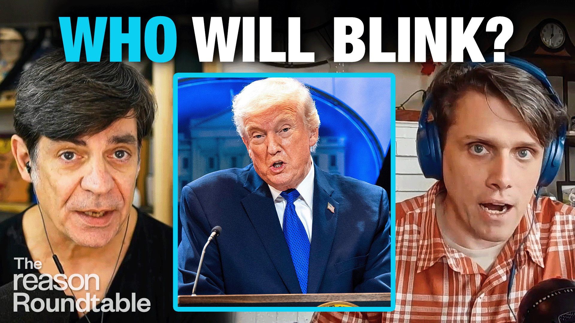 Nick Gillespie appears on the left, Eric Boehm appears on the right. In the center square, there is an image of President Donald Trump in the White House briefing room. Bold text across the top of the screen reads "WHO WILL BLINK?"
