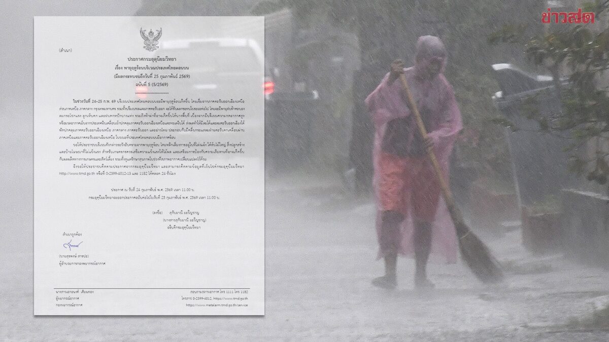 กรมอุตุฯ ประกาศฉบับที่ 5 เตือน พายุฤดูร้อนถล่ม ฝนกระหน่ำ ตกหนักบางแห่ง ลมกระโชกแรง ลูกเห็บตก ฟ้าผ่า ระวังอันตราย เลี่ยงอยู่ที่โล่งแจ้ง ใต้ต้นไม้ใหญ่ วันที่ 24 ก.พ.2569 กรมอุตุนิยมวิทยา ประกาศ เรื่อง พายุฤดูร้อนบริเวณประเทศไทยตอนบน (มีผลกระทบจนถึงวันที่ 25 กุมภาพันธ์ 2569) ฉบับที่ 5 (5/2569) ระบุว่า ในช่วงวันที่ 24-25 ก.พ. 69 บริเวณประเทศไทยตอนบนจะมีพายุฤดูร้อนเกิดขึ้น โดยเริ่มจากภาคตะวันออกเฉียงเหนือ ส่วนภาคเหนือ ภาคกลาง กรุงเทพมหานคร รวมทั้งปริมณฑลและภาคตะวันออก จะได้รับผลกระทบในระยะต่อไป โดยจะมีพายุฝนฟ้าคะนอง ลมกระโชกแรง ลูกเห็บตก และฝนตกหนักบางแห่ง รวมถึงฟ้าผ่าที่อาจเกิดขึ้นได้บางพื้นที่ เนื่องจากมีบริเวณความกดอากาศสูงหรือมวลอากาศเย็นจากประเทศจีนเคลื่อนเข้าปกคลุมภาคตะวันออกเฉียงเหนือและทะเลจีนใต้ ส่งผลทำให้มีลมใต้และลมตะวันออกเฉียงใต้พัดปกคลุมภาคตะวันออกเฉียงเหนือ ภาคกลาง ภาคตะวันออก และอ่าวไทย ประกอบกับมีคลื่นกระแสลมฝ่ายตะวันตกเคลื่อนผ่านภาคเหนือและภาคตะวันออกเฉียงเหนือ ในขณะที่ประเทศไทยตอนบนมีอากาศร้อน อ่านข่าว : สภาพอากาศวันนี้ 54 […]