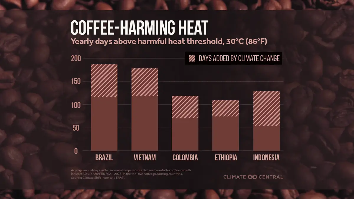 Nová analýza organizace Climate Central zjistila, že klimatické změny zvyšují počet dní s teplotami škodlivými pro kávu v hlavních kávových oblastech po celém světě. Snižuje to výnosy sklizní a přispívá k vyšším cenám pro spotřebitele.