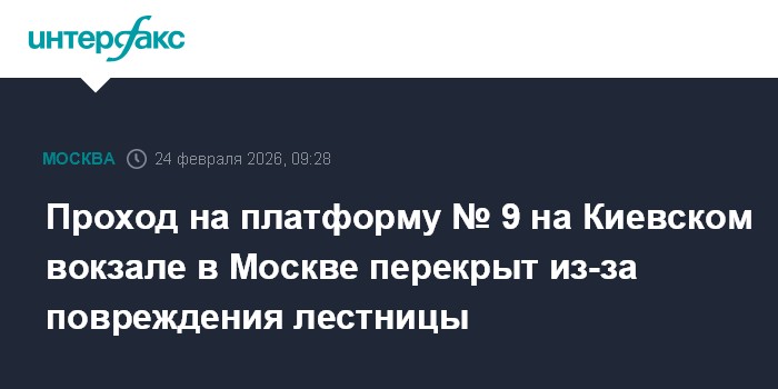 Проход на платформу № 9 для поездов дальнего следования на Киевском вокзале временно закрыт из-за повреждения фрагмента лестничного схода, на движение поездов ситуация не повлияла, сообщили в Московской железной дороге (МЖД)."Сегодня примерно в 7:10 на Киевском вокзале произошло повреждение фрагмента лестничного схода, ведущего на платформу № 9 для поездов дальнего следования.
