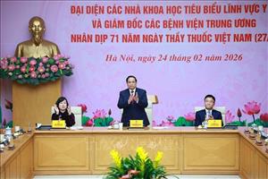 Chiều 24/2/2026, tại Hà Nội, Thủ tướng Phạm Minh Chính gặp mặt đại diện các chuyên gia, nhà khoa học tiêu biểu trong lĩnh vực y tế và lãnh đạo các bệnh viện trung ương nhân Kỷ niệm 71 năm Ngày Thầy thuốc Việt Nam (27/2/1955 - 27/2/2026).
