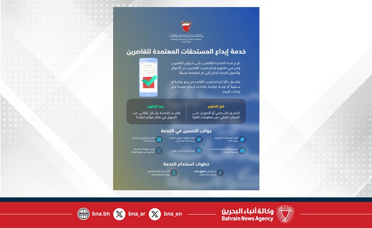 المنامة في 24 فبراير / بنا / في إطار الجهود الحكومية الرامية إلى تطوير جودة الخدمات وإعادة هندستها، أعلنت وزارة العدل والشؤون الإسلامية والأوقاف عن إطلاق خدمة إيداع المستحقات المعتمدة للقاصرين، وذلك بالتعاون مع شركة "بنفت" عبر نظام "فواتير". وأوضحت الوزارة أن خدمة إيداع المستحقات المعتمدة تتيح للقائمين على شؤون القاصرين ومن في حكمهم إيداع نصيب القاصر من الأموال والأصول المدرة للدخل التي تم اعتمادها مسبقًا، بما في ذلك إيداع نصيبه من بيع مركبة، أو سفينة، أو لوحة...