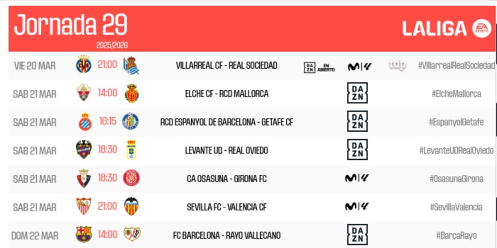 LaLiga ha hecho oficial los horarios de los partidos que componen la Jornada 29 de LaLiga EA Sports, en la que el Real Betis visitará el estadio de San Mamés para medirse al Athletic Club de Bilbao el domingo 22 de marzo a las 18.30 horas. Esta jornada arrancará el viernes 20 de marzo a las 21.00 con el encuentro entre Villarreal y Real Sociedad en el Estadio de la Cerámica y finalizará el domingo 22 de marzo a las 21.00 con el derbi de la capital entre Real Madrid y Atlético de Madrid.