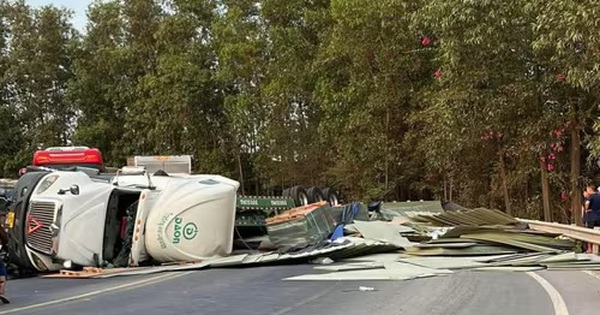 (NLĐO)- Xe đầu kéo container hàng lật nhào khi ôm cua xuống dốc đường dẫn cầu Thủ Biên nối tỉnh Đồng Nai với TPHCM