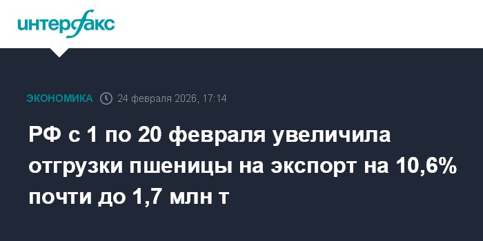 РФ с 1 по 20 февраля отгрузила на экспорт 1,66 млн тонн пшеницы, что на 10,6% больше, чем за аналогичный период 2025 года.