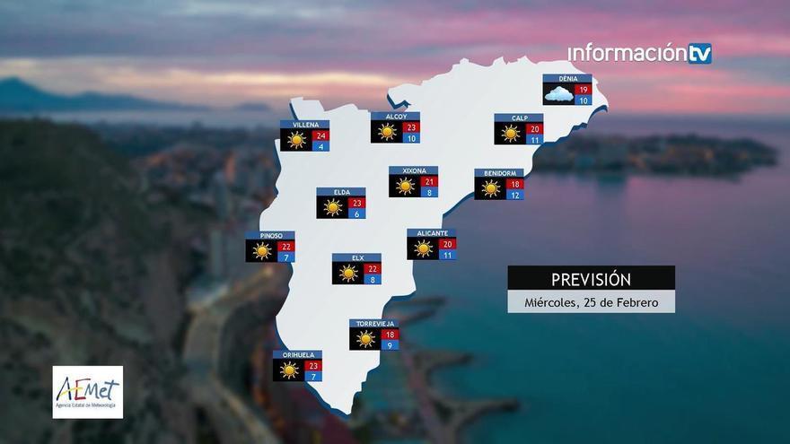 Según la Agencia Estatal de Meteorología, mañana miércoles, 25 de febrero tendremos un cielo poco nuboso aunque no se descartan brumas y niebla en el litoral a primera y última hora del día. El viento será flojo de dirección variable, con predominio hacia el mediodía en el este.
