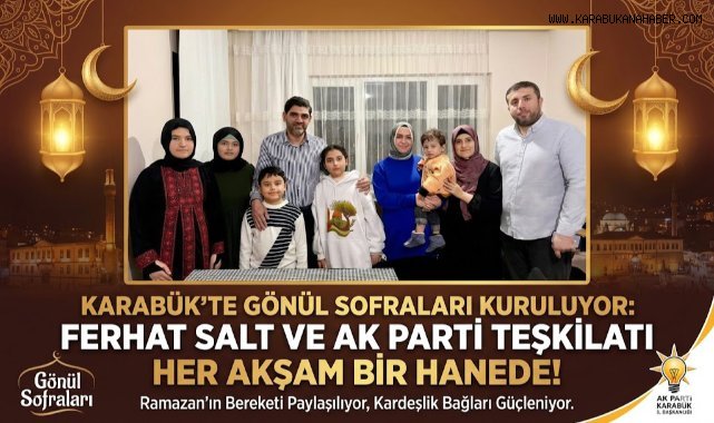 AK Parti Karabük İl Başkanlığı, Ramazan ayında birlik ve dayanışmayı güçlendirmek amacıyla “Gönül Sofraları” programını sürdürüyor. Ferhat Salt öncülüğünde teşkilat mensupları, her akşam farklı hanelerde iftar yaparak vatandaşlarla bir araya geliyor ve Ramazan’ın manevi atmosferi paylaşılıyor. Salt, Ramazan’ın kardeşlik ve dayanışma duygularını artırdığını belirterek, Recep Tayyip Erdoğan liderliğinde Türkiye genelinde yürütülen bu programı Karabük’te de hassasiyetle sürdürdüklerini ifade etti.