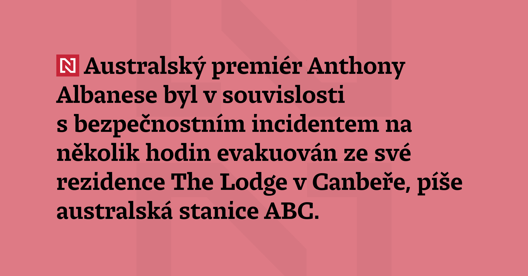 Australský premiér Anthony Albanese byl v souvislosti s bezpečnostním incidentem na několik hodin evakuován ze své rezidence The Lodge v Canbeře, píše australská stanice ABC. Australské úřady bezpečnostní incident blíže neupřesnily, tamní federální policie pouze uvedla, že neobjevila nic podezřelého a že další podrobnosti zveřejní později. (ABC)