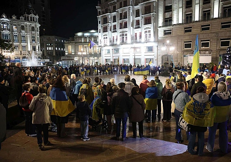 Centenares de ucranianos se manifiestan en el centro de Oviedo para pedir ayuda en el cuarto aniversario de la guerra
