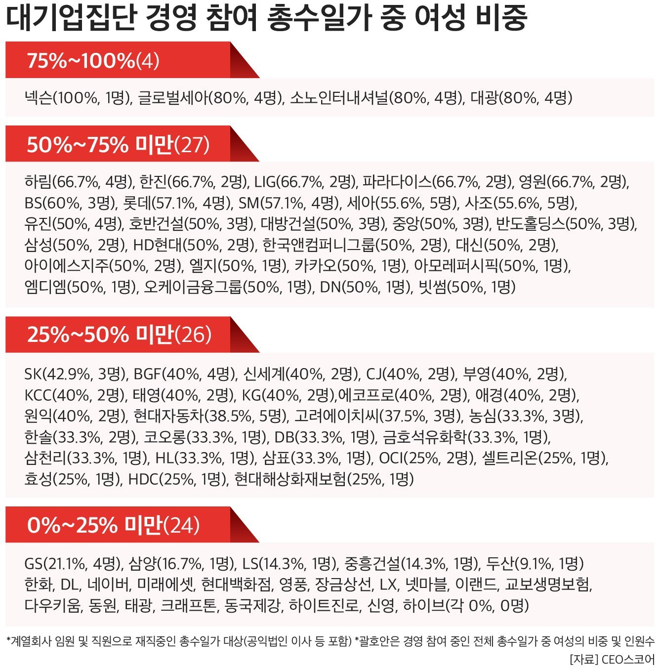 국내 대기업 총수일가 가운데 여성의 경영 참여가 점진적으로 확대하고 있는 것으로 나타났다. 자녀세대에서 여성 비중이 부모세대보다 높았으며, 자산 규모가 작은 그룹일수록 여성 총수일가의 등기임원 참여가 활발했다.25일 기업데이터연구소 CEO스코어에 따르면 지난해 총수가 있는 기업 81곳을 대상으로 총수일가의 경영 참여 현황을 조사한 결과, 지난달 말 기준 경영에 참여 중인 총수일가 370명 가운데 여성은 137명으로 37%를 차지했다.기업지배구조 투명성 강화와 이사회 다양성 확대 요구가 커지는 흐름 속에서 총수일가 여성의 경영 전면 참여도 점차 늘어나는 추세다.세대별로 보면 자녀세대의 여성 경영 참여 비중이 부모세대보다 높았다. 부모세대는 총 202명 중 여성 70명으로 34.7%였고, 자녀세대는 168명 중 67명으로 39.9%를 나타냈다. 자산 규모별로는 상위 50대 그룹보다 하위 그룹에서 여성 총수일가의 경영 참여가 10%포인트 이상 높았다. 총수일가가 지분을 대부
