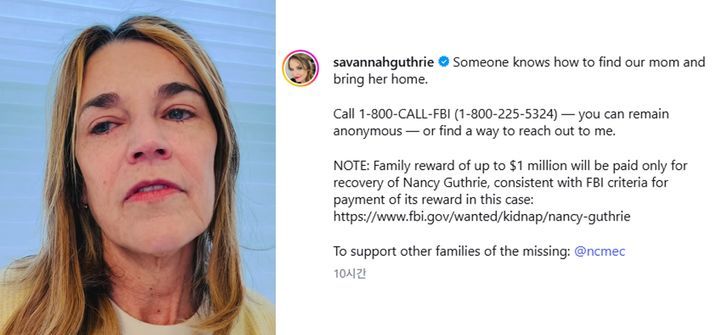 미국 유명 앵커가 실종된 어머니를 찾기 위해 100만 달러(약 14억 4000만원)의 현상금을 내걸었다.미국 NBC ‘투데이’ 앵커인 서배너 거스리는 24일(현지시간) 자신의 인스타그램에 4분 가량 길이의 영상을 올려 “애리조나 투손 자택에서 납치된 것으로 추정되는 어머니를 그리워하고 있다”며 이같이 밝혔다. 거스리는 “어머니가 이미 세상을 떠났을 수도 있지만, 여전히 기적을 믿고 있다. 사랑하는 어머니를 집으로 돌려보낼 수 있도록 도와 달라”고 호소했다.그가 제시한 보상금 100만 달러는 낸시의 위치를 찾는 데 결정적 정보를 제공한 사람에게 지급된다. 현재 FBI가 내건 보상금 10만 달러와는 별도다. 두 보상금 모두 청구자가 여럿일 경우 분할 지급된다.서배너의 모친 낸시 거스리(84)는 지난달 31일 애리조나 주 투손 인근 자택에서 마지막으로 목격된 후 자취를 감췄다. 다음 날 정기적으로 나타나던 교회 예배에 참석하지 않자 실종 신고가 접수됐다. 특히 실종 직전 밤 현관