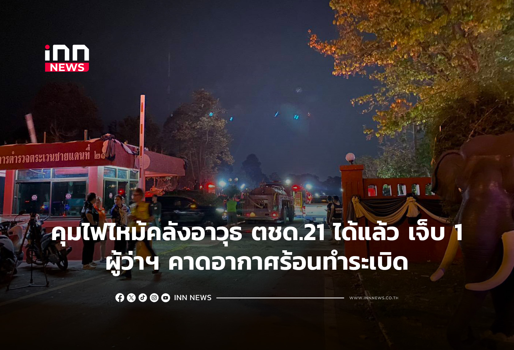 เจ้าหน้าที่ควบคุมเหตุไฟไหม้คลังเก็บกระสุนภายใน ตชด.21 จ.สุรินทร์ ได้แล้ว บาดเจ็บ 1 นาย อาการปลอดภัยแล้ว ผู้ว่าฯ คาดสาเหตุอาจเกิดจากอากาศร้อน ไม่ใช่วินาศกรรม