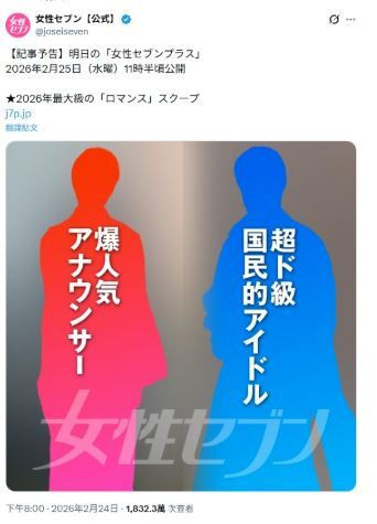 日本娛樂圈今日公布超級核彈消息,據傳一位「超重量級國民偶像」與「人氣爆棚女主播」戀愛消息即將曝光,瞬間引爆日娛樂圈震撼彈。 日本知名週刊《女性SEVEN》昨日在社群平...…
