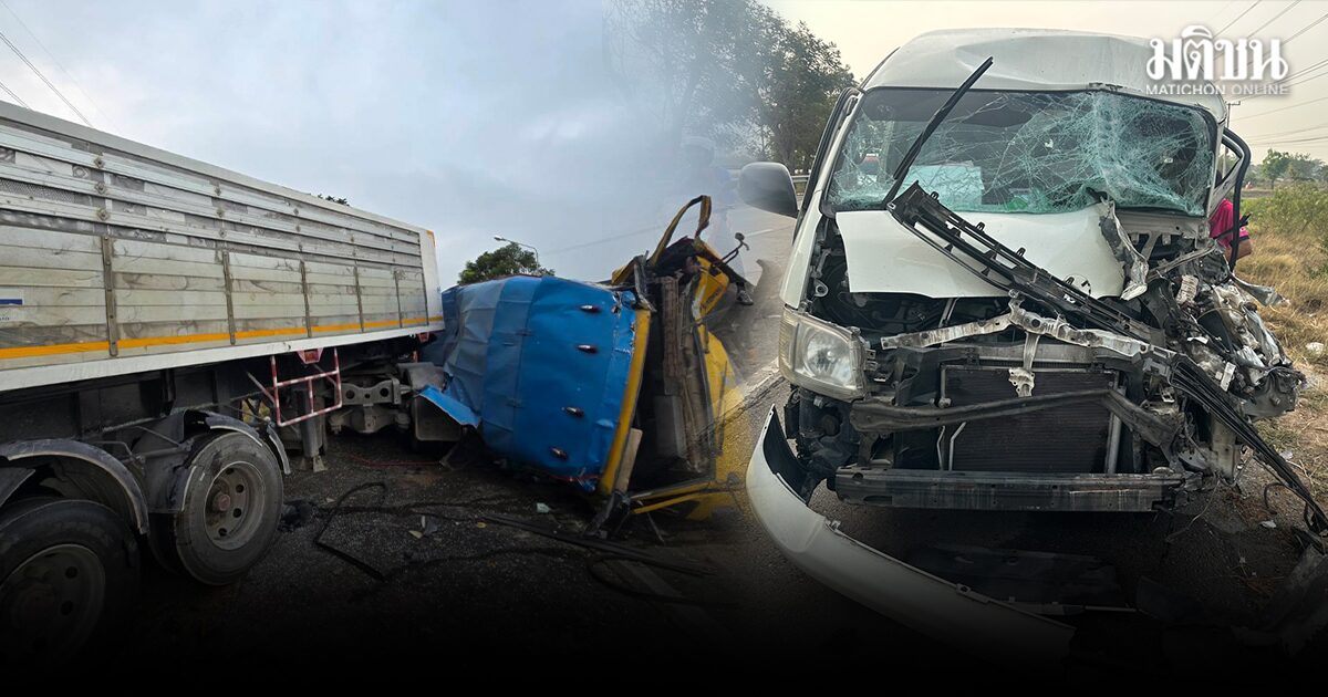 รถรับส่งนักเรียน เสียหลักชนกัน ก่อนเข้าชนรถบรรทุกพ่วง18ล้อที่จอดข้างทาง เด็กบาดเจ็บระนาว