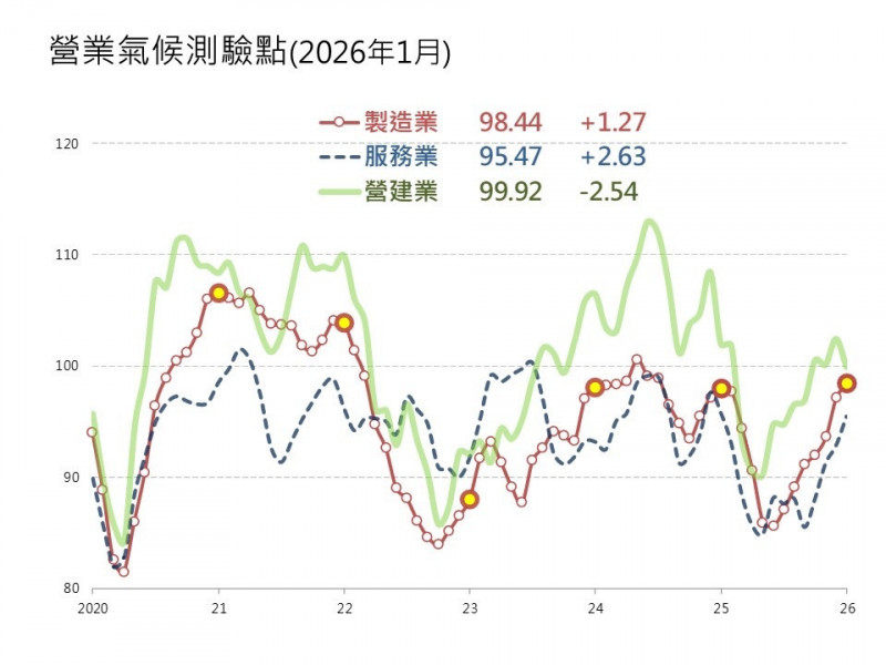 台經院今公布景氣動向調查報告,1月製造業測驗點已連續7個月上揚,服務業亦呈連續4個月上揚,營建業則再次轉為下滑態勢。 台經院今公布1月3大產業營業氣候測驗點,製造業營...…
