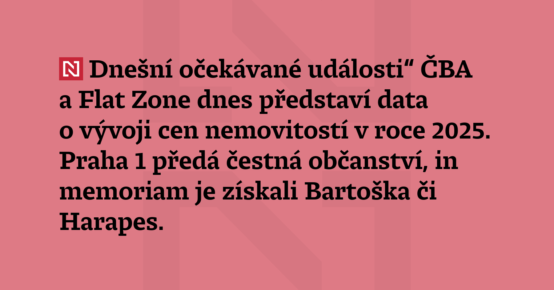 Dnešní očekávané události“ ČBA a Flat Zone dnes představí data o vývoji cen nemovitostí v roce 2025. Praha 1 předá čestná občanství, in memoriam je získali Bartoška či Harapes.