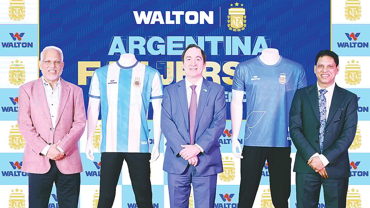 ২০২৬ বিশ্বকাপ ফুটবল সামনে রেখে বাংলাদেশে আর্জেন্টিনার ফ্যান জার্সির মোড়ক উন্মোচন করেছে ওয়ালটন।