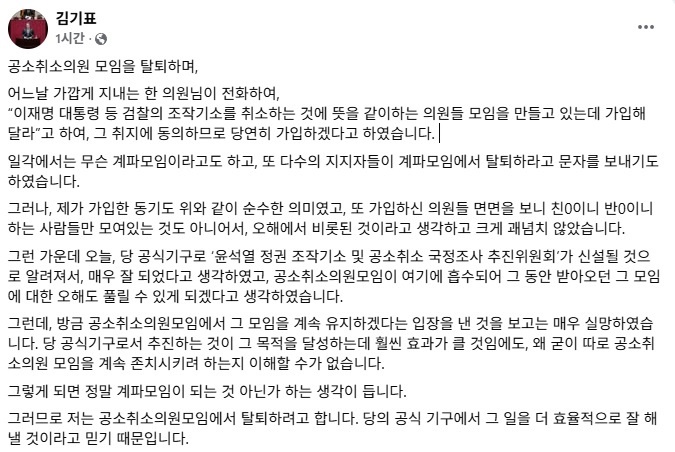 김기표 더불어민주당 의원이 지난 23일 출범한 '이재명 대통령 사건 공소 취소와 국정조사 추진을 위한 의원모임'(아래 공취모)에서 탈퇴했다고 밝혔다. 김기표 "공소취소 당 공식기구 신설에도 모임 유지에 매우 실망" 25일 김기표 의원은 "공소취소의원 모임을 탈퇴하며"라는 제목의 페이스북 게시글을 올렸다. 김 의원은 "어느날 가깝게 지내는 한 의원님이 전화하여 "이재명 대통령 등 검찰의 조작기소를 취소하는 것에 뜻을 같이하는 의원들 모임을 만들고 있는데 가입해 달라"고 하여, 그 취지에 동의하므로 당연히 가입하겠다고 하였다"며 공취모 가입 동기를 설명했다. 전체 내용보기