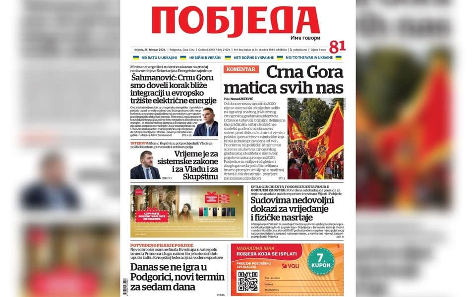 Naslovnica "Pobjede" 25. februar 2026.