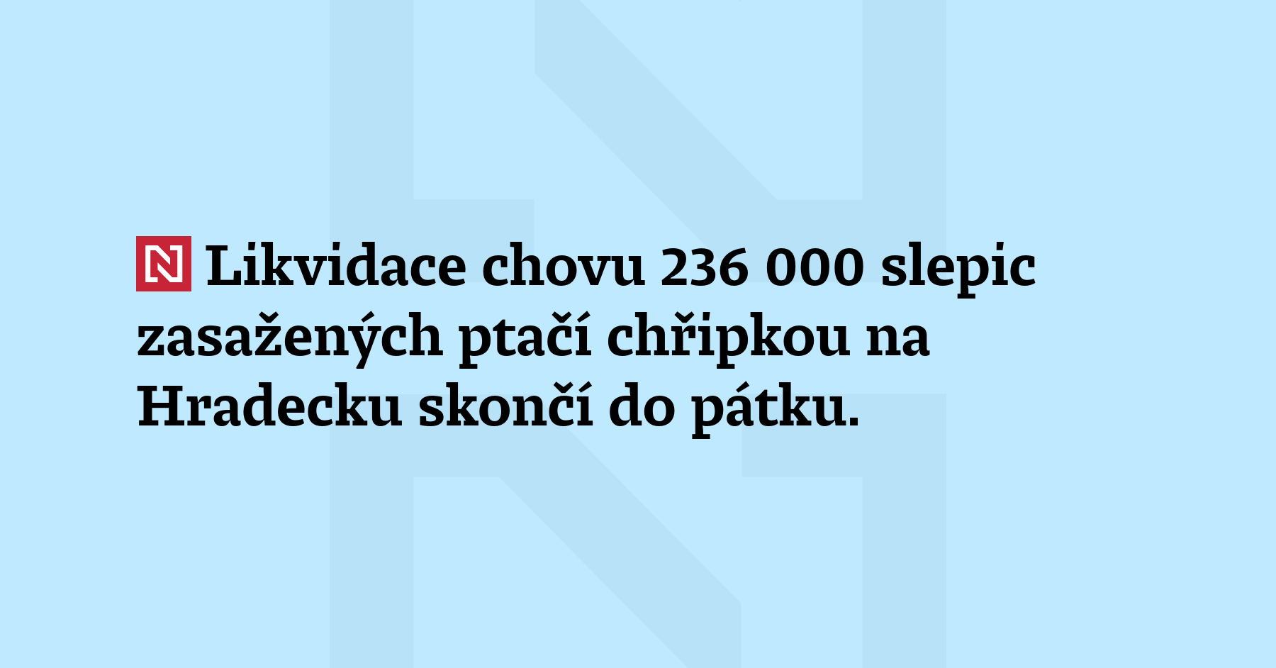 Likvidace chovu 236 000 slepic zasažených ptačí chřipkou na Hradecku skončí do pátku. Začala v pondělí. Počet zasahujících hasičů stoupl na 150. (ČTK)