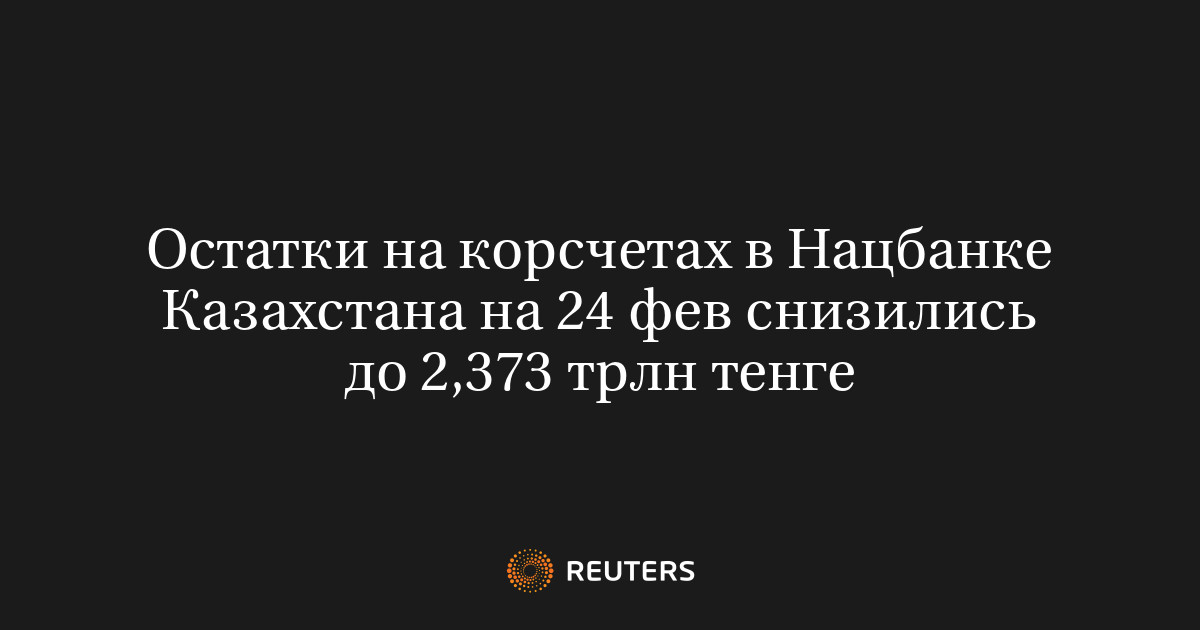 АЛМА-АТА, 25 фев (Рейтер) - ‌Остатки ​на корреспондентских счетах ​кредитных ​организаций ⁠в ‌Национальном ‌банке Казахстана ​на 24 ‌февраля ​снизились до ‌2,373 триллиона тенге ​с ​2,486 ‌триллиона тенге ​ранее, сообщил ЦБ. Ниже следуют ​данные ⁠ЦБ на ‌отчетную ‌дату: объем в млрд ​тенге 24.02.2026 2,373,025 23.02.2026 2,486,427 20.02.2026 2,469,675 19.02.2026 2,495,221 18.02.2026 2,587,742 17.02.2026 2,666,408 16.02.2026 2,198,358 13.02.2026 2,466,265 12.02.2026 2,357,451 11.02.2026 2,468,499 10.02.2026 2,453,610 09.02.2026 2,609,459 06.02.2026 2,424,587 05.02.2026 2,598,101 04.02.2026 2,557,558 03.02.2026 2,793,226 02.02.2026 2,766,876 30.01.2026 2,769,270 29.01.2026 2,788,625 28.01.2026 2,734,919 27.01.2026 2,689,721 26.01.2026 2,600,009 23.01.2026 2,535,978 22.01.2026 2,510,247 21.01.2026 2,616,484 20.01.2026 2,654,859 19.01.2026 2,405,571 16.01.2026 2,256,185 15.01.2026 2,185,220 14.01.2026 2,211,431 13.01.2026 2,372,048 12.01.2026 2,199,525 09.01.2026 2,360,327 08.01.2026 2,477,293 06.01.2026 2,474,063 05.01.2026 2,564,204 31.12.2025 2,657,234 30.12.2025 2,835,165 29.12.2025 3,073,042 26.12.2025 2,744,553 25.12.2025 2,740,484 24.12.2025 2,700,644 23.12.2025 2,667,079 22.12.2025 2,236,550 19.12.2025 2,333,243 18.12.2025 2,274,993 17.12.2025 2,529,312 15.12.2025 2,808,198 12.12.2025 2,652,826 11.12.2025 2,699,329 10.12.2025 2,772,991 09.12.2025 2,547,930 08.12.2025 2,553,853 05.12.2025 2,583,945 04.12.2025 2,452,649 03.12.2025 2,534,934 02.12.2025 2,594,849 01.12.2025 2,556,746 28.11.2025 2,753,321 27.11.2025 2,560,694 26.11.2025 2,805,496 25.11.2025 2,471,417 24.11.2025 2,283,247 21.11.2025 2,450,113 20.11.2025 2,455,774 19.11.2025 2,459,351 18.11.2025 2,435,855 17.11.2025 2,435,513 14.11.2025 2,415,094 13.11.2025 2,369,645 12.11.2025 2,580,818 11.11.2025 2,590,711 10.11.2025 2,419,064 07.11.2025 2,431,914 06.11.2025 2,423,393 05.11.2025 2,495,022 04.11.2025 2,545,971 03.11.2025 2,597,334 31.10.2025 2,881,705 30.10.2025 2,793,727 29.10.2025 2,745,460 28.10.2025 2,752,841 24.10.2025 2,588,646 23.10.2025 2,529,805 22.10.2025 2,493,099 21.10.2025 2,150,410 20.10.2025 2,623,210 17.10.2025 2,337,661 16.10.2025 2,389,352 15.10.2025 2,388,543 14.10.2025 2,420,694 13.10.2025 2,522,302 10.10.2025 2,691,859 09.10.2025 2,569,515 08.10.2025 2,486,483 07.10.2025 2,505,646 06.10.2025 2,434,278 03.10.2025 2,496,651 02.10.2025 2,486,000 01.10.2025 2,706,971 30.09.2025 2,592,892 29.09.2025 2,139,682 26.09.2025 2,577,870 25.09.2025 2,479,504 24.09.2025 2,408,075 23.09.2025 2,451,517 22.09.2025 2,505,136 19.09.2025 2,506,286 18.09.2025 2,594,435 17.09.2025 2,648,283 16.09.2025 2,565,861 15.09.2025 2,583,005 12.09.2025 2,566,470 11.09.2025 2,575,840 10.09.2025 2,527,868 09.09.2025 2,504,665 08.09.2025 2,654,594 05.09.2025 2,603,788 04.09.2025 2,584,078 03.09.2025 2,626,725 02.09.2025 2,438,074 29.08.2025 887,646 28.08.2025 843,818 27.08.2025 765,958 26.08.2025 766,280 25.08.2025 761,560 22.08.2025 821,383 21.08.2025 710,077 20.08.2025 748,827 19.08.2025 686,416 18.08.2025 765,074 15.08.2025 835,820 14.08.2025 767,036 13.08.2025 781,665 12.08.2025 663,774 11.08.2025 718,834 08.08.2025 781,869 07.08.2025 718,340 06.08.2025 752,370 05.08.2025 853,473 04.08.2025 619,161 01.08.2025 804,357 31.07.2025 889,815 30.07.2025 779,343 29.07.2025 730,092 28.07.2025 800,311 25.07.2025 805,859 24.07.2025 821,768 23.07.2025 816,163 22.07.2025 844,123 21.07.2025 778,894 18.07.2025 739,015 17.07.2025 967,789 16.07.2025 746,310 15.07.2025 765,654 14.07.2025 707,010 11.07.2025 759,684 10.07.2025 807,127 09.07.2025 787,433 08.07.2025 710,962 04.07.2025 679,730 03.07.2025 607,465 02.07.2025 566,615 01.07.2025 719,319 30.06.2025 767,639 27.06.2025 781,189 26.06.2025 768,343 25.06.2025 749,506 24.06.2025 680,742 (Мария ‌Гордеева)