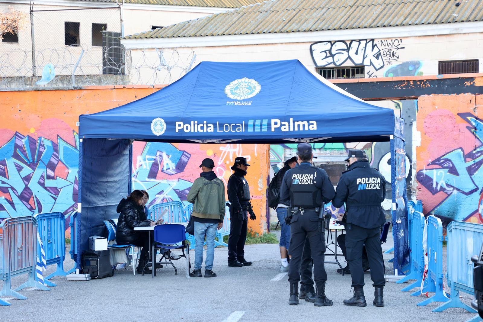 Desde las siete de la mañana, un amplio dispositivo de la Policía Local, junto con técnicos de Asuntos Sociales, ha acampado delante de la entrada principal de la antigua cárcel de Palma. Una carpa con mesas identifica a las personas que entran y salen. Un grupo grande de jóvenes, apenas veinteañeros, grita a los numerosos medios congregados cuando salen: «No me grabéis, no tenéis mi consentimiento».