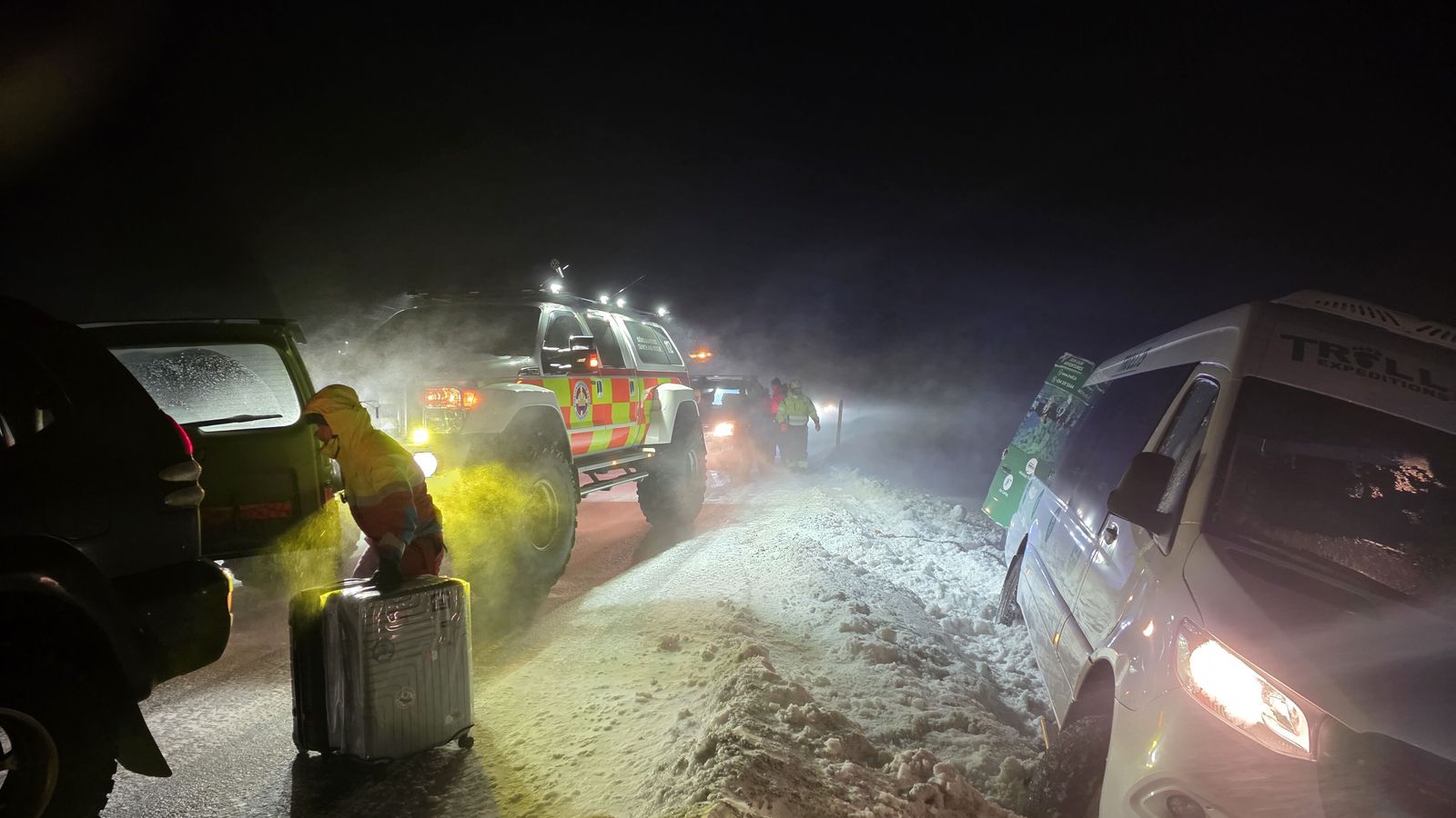 Björgunarsveitarfólk á Austurlandi hafði í nægu að snúast í hvassviðri og kófi í gærkvöldi. Fjórtán manns í smárútu sem lenti utan vegar í Fagradal var komið til aðstoðar og ferðafólki í nokkrum bílum á Mývatns- og Möðrudalsöræfu.