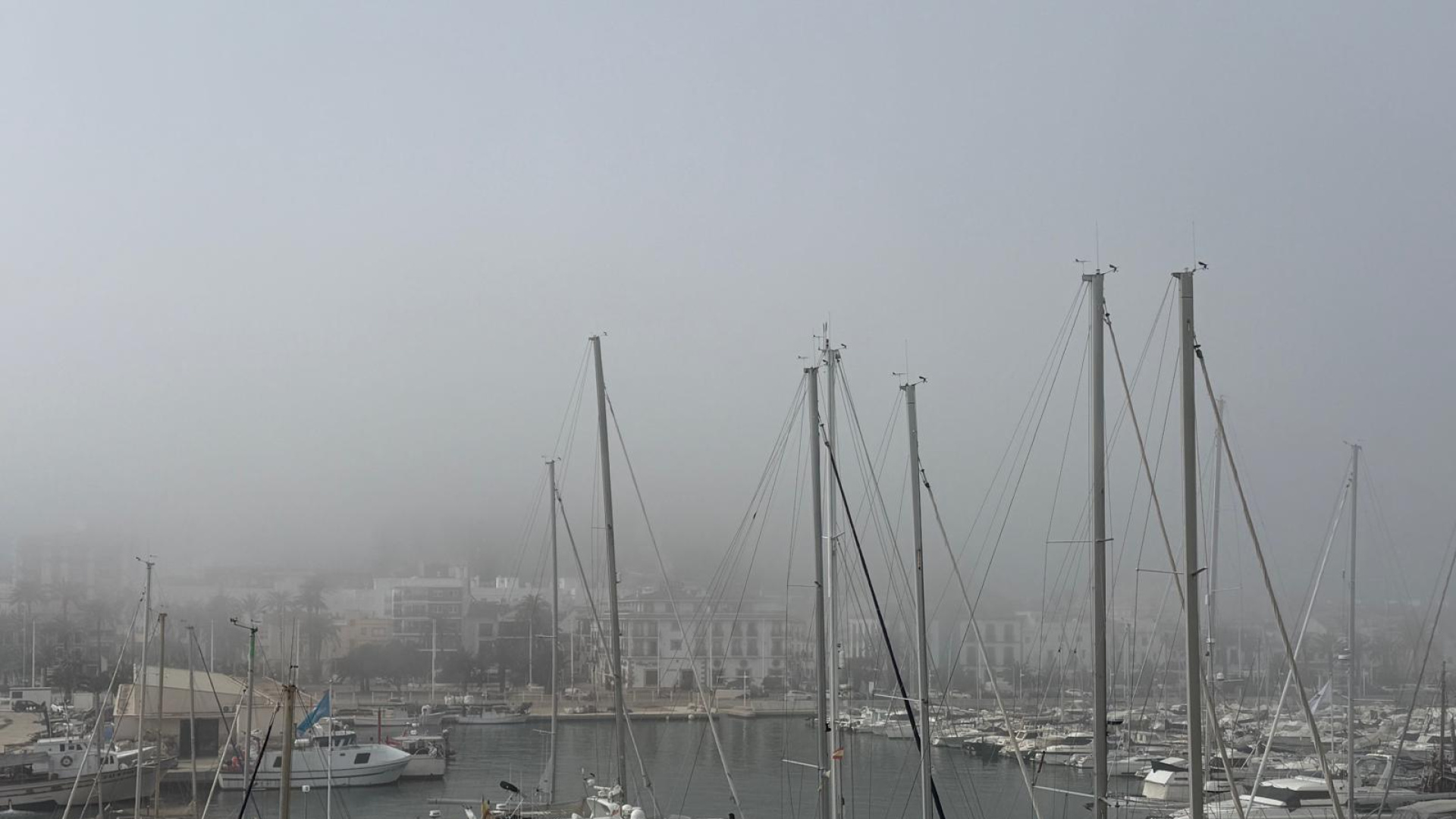 La luminosidad con la que ha amanecido este miércoles en la Marina Alta se ha ido apagando con rapidez a medida que avanzaba la mañana. Una densa niebla ha terminado por cubrir buena parte del litoral, borrando casi por completo el perfil de edificios, calles y montañas. En Dénia, las imágenes tomadas desde el puerto hacia la fachada marítima mostraban un paisaje prácticamente invisible. La visibilidad era tan reducida que, en pleno centro de la localidad, los edificios más altos resultaban imperceptibles. A medida que el sol se ha ido ocultando tras la capa gris, ha aumentado la sensación de frío y, sobre todo, de humedad e incluso sensación de lluvia muy fina. Se trata, sin embargo, de un fenómeno meteorológico relativamente habitual en esta época del año, conocido como nieblas de advección. Los expertos explican que su origen está en el contraste térmico entre el agua fría del mar Mediterráneo y la masa de aire más cálida mantenida durante varios días por la estabilidad anticiclónica. Cuando el aire templado entra en contacto con la superficie marina, el vapor de agua se condensa y se transforma en nubes muy bajas. Estas capas nubosas, empujadas por la brisa, acaban alcanzando la costa y dejan estampas de gran impacto visual. Son situaciones frecuentes en el tramo final del invierno, cuando la estación avanza hacia la primavera, y también suelen repetirse durante el otoño.