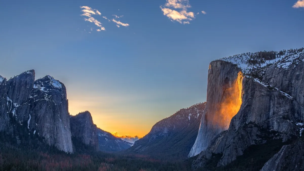 Sunčeve zrake odbijaju se od vode koja pada, stvarajući intenzivnu narančasto-crvenu boju koja podsjeća na vatreni slap